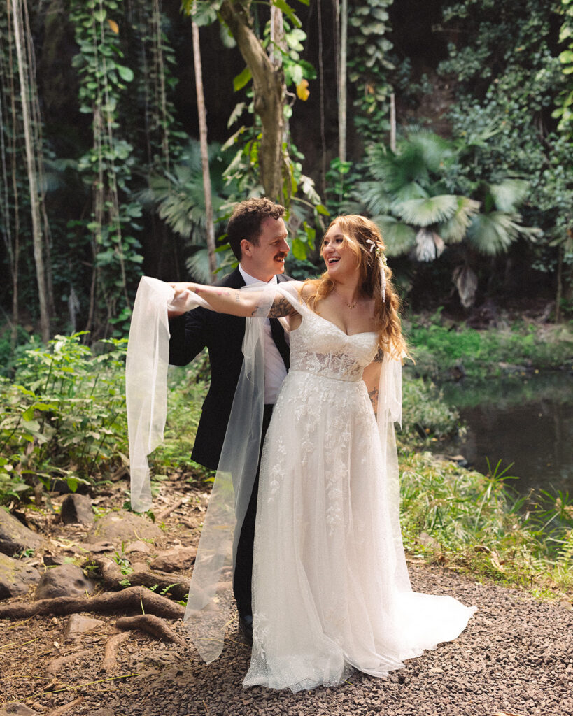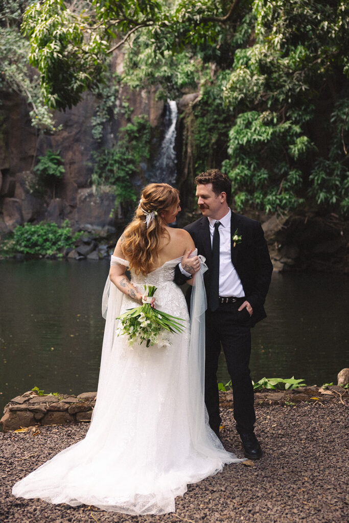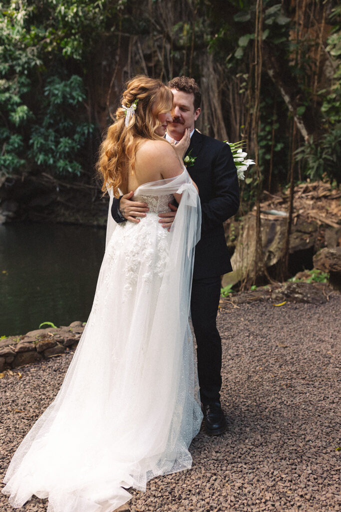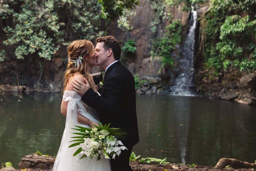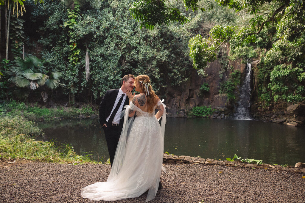 Their ceremony spot was tucked beside a stunning Kauai waterfall, surrounded by deep green jungle and mist floating through the air. It was quiet except for the water rushing behind them, creating the most natural, peaceful soundtrack to their vows.