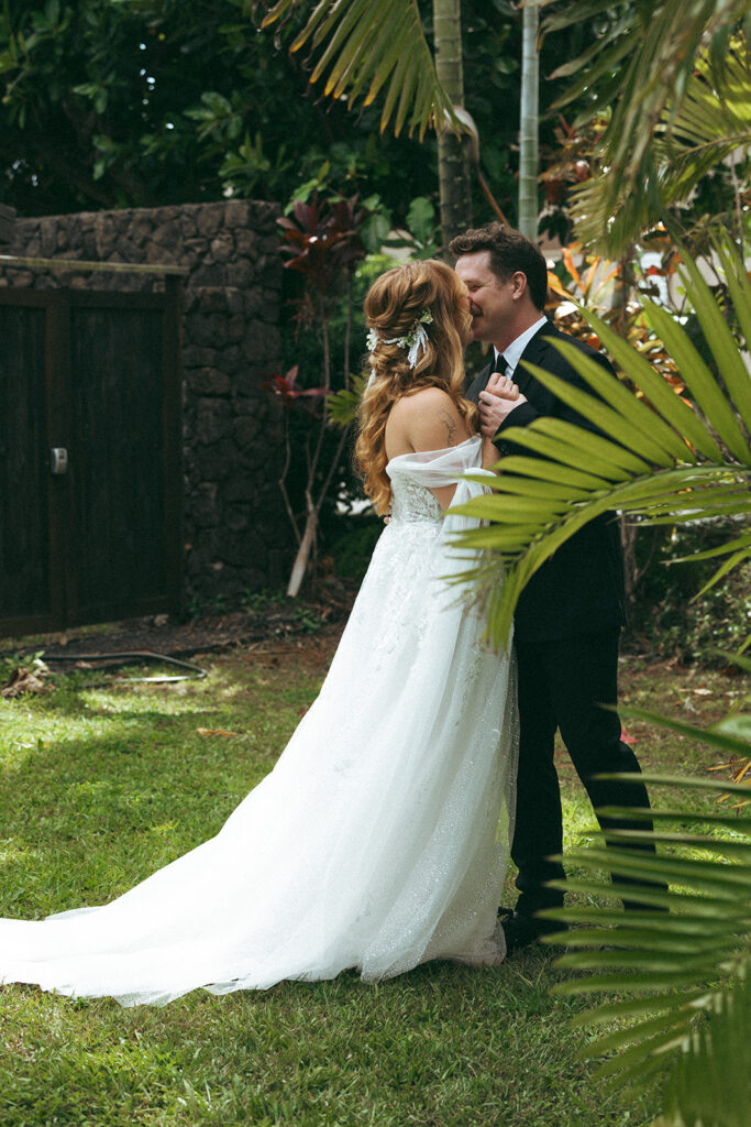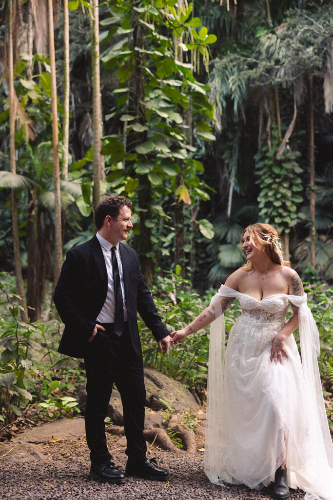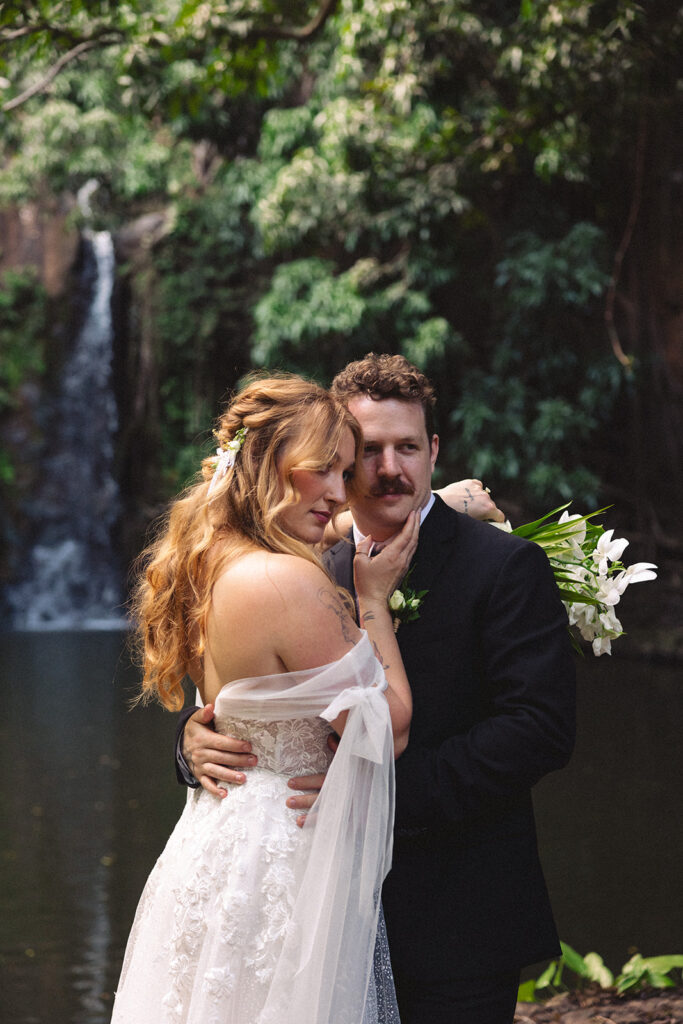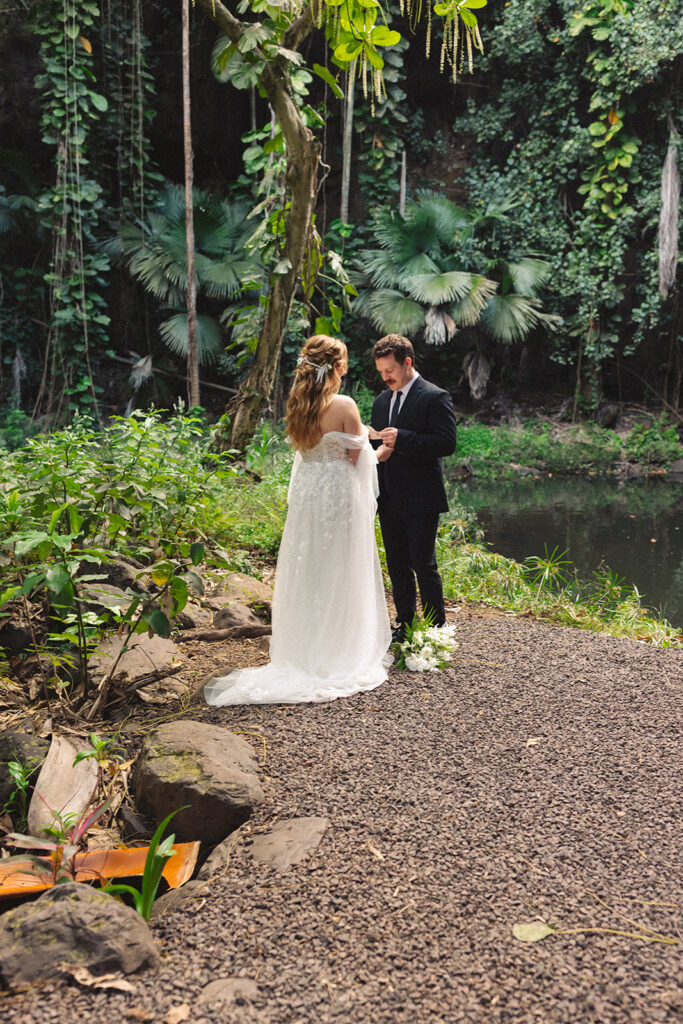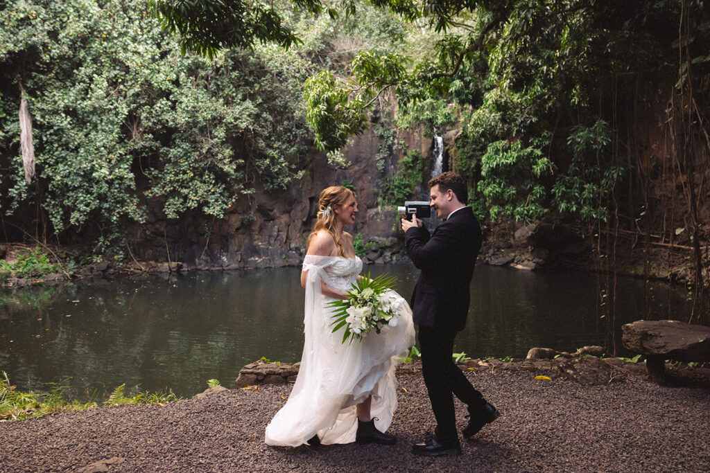 Their ceremony spot was tucked beside a stunning Kauai waterfall, surrounded by deep green jungle and mist floating through the air. It was quiet except for the water rushing behind them, creating the most natural, peaceful soundtrack to their vows.