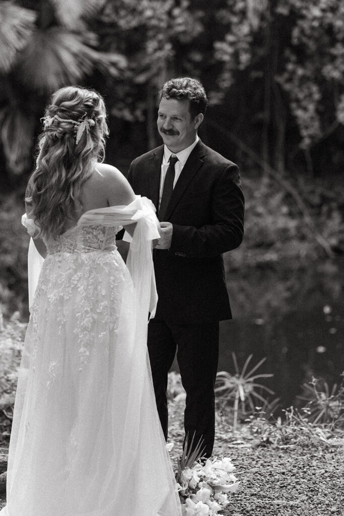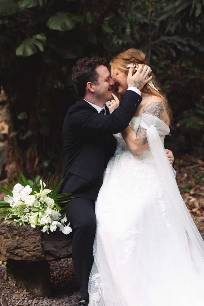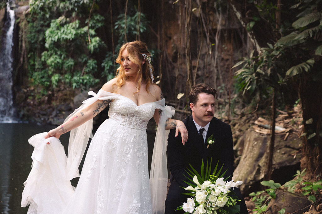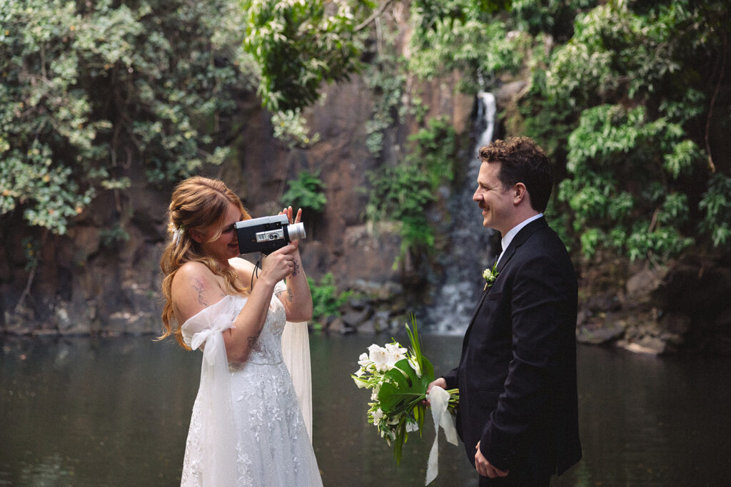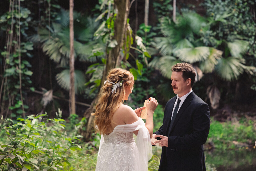 Blooms by Kim created a simple, tropical bouquet that complimented the surroundings perfectly—lush, earthy tones that didn’t compete with the dramatic backdrop, but enhanced it. Courtnee and Joshua read their vows to each other with water droplets catching the light, completely wrapped up in the moment. No audience, no distractions—just the two of them promising forever in one of the most beautiful places on earth.